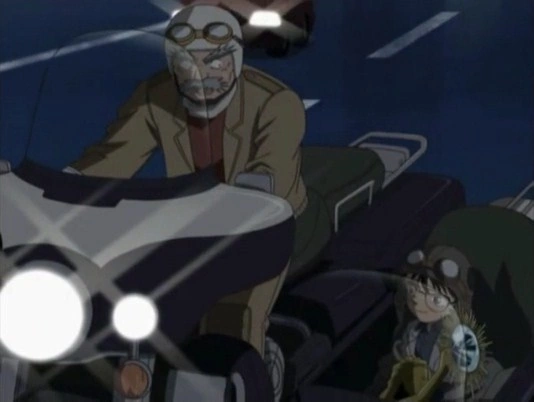 En Kaito Kid pren la motocicleta amb sidecar i la cara d’en Jirokichi Suzuki per robar la Blue Wonder.